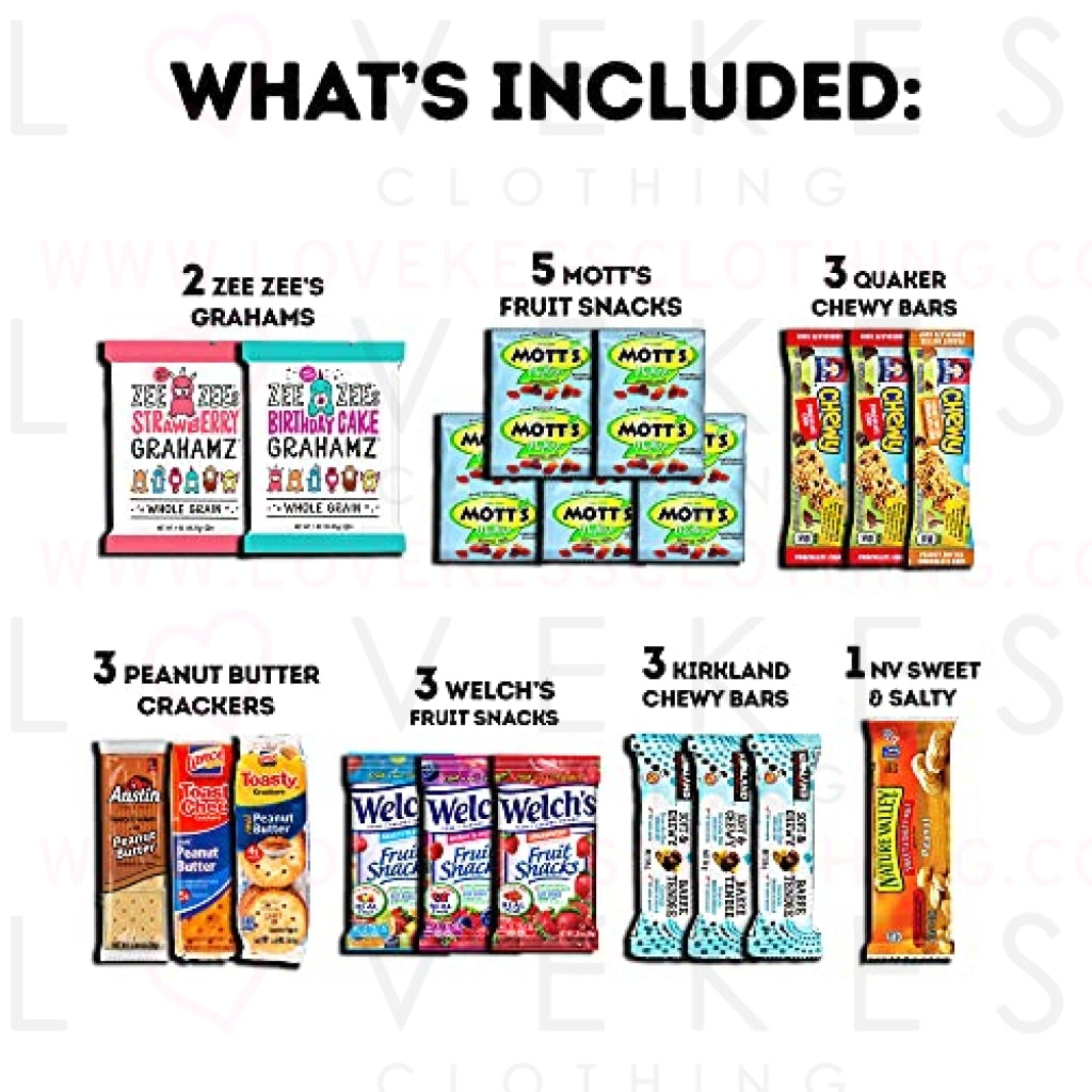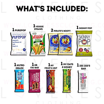 - DIMENSIONS: 12.2in x 10.5in x 3in. Gift wrapping and message available at checkout. Contents included: 1 PurePop Popcorn, 1 Veggie Straws, 2 Pirate’s Booty, 1 Skinny Pop, 2 ZeeZee Grahams, 1 Nutrigrain, 1 Fig Bar, 1 Nature Valley Fruit & Nut, 1 NV Oats & Honey, 1 ZeeZee’s Bar, 1 NV Sweet & Salty, 5 Mott’s Fruit Snacks, 3 PB Crackers, 3 Fruit Snacks, 3 Kirkland Chewy, and more!
